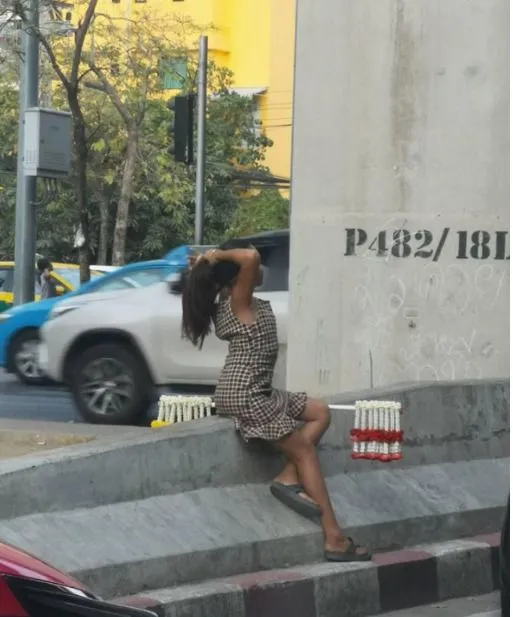 นางแบบชัดๆ! แม่ค้าขายพวงมาลัย กับท่าทางการมัดผมสุดมั่น
