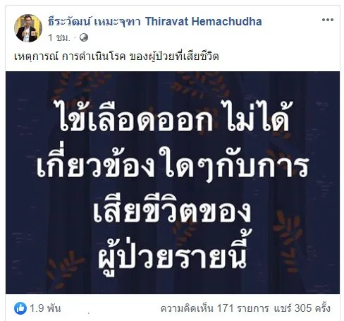 นอกจากนี้ศ.นพ.ธีระวัฒน์ ยังโพสต์อีกด้วยว่า ไข้เลือดออกไม่ได้เกี่ยวข้องใดๆ กับการเสียชีวิตของผู้ป่วยรายนี้
