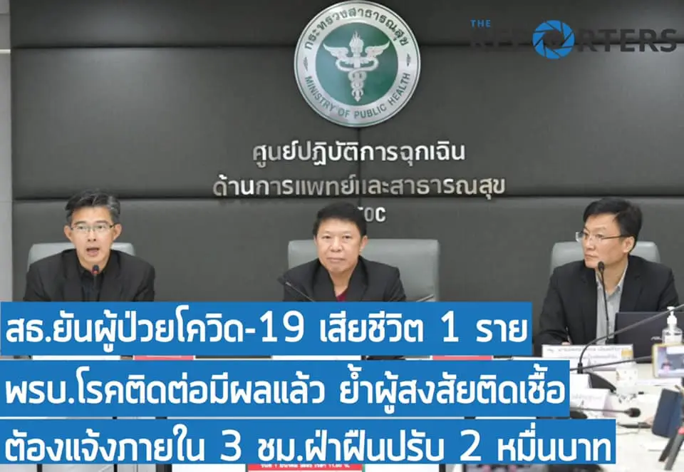 COVID19:กระทรวงสาธารณสุขย้ำพรบ.โรคติดต่อ มีผลบังคับใช้ในวันนี้ หากพบผู้ป่วยและสงสัยว่าติดเชื้อไวรัสโคโรนา 2019 ให้แจ้งต่อแจ้งต่อเจ้าพนักงานควบคุมโรคติดต่อภายใน 3 ชั่วโมง หากฝ่าฝืนมีโทษปรับไม่เกิน 20,000 บาท เผย ผู้ป่วยยืนกันกลับบ้านได้ 2 ราย ผู้ป่วยอาการหนักเสียชีวิต 1 ราย