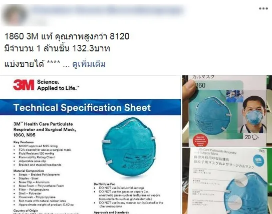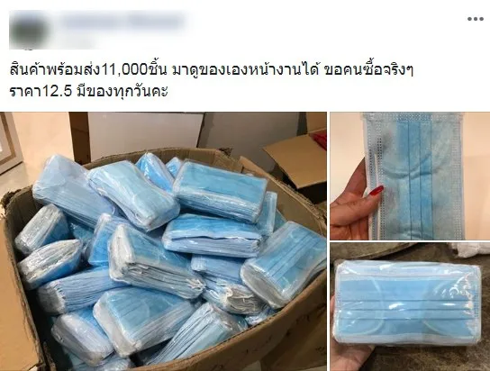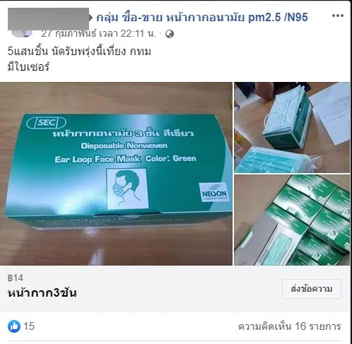 โดยล่าสุดพบว่ามีหน้ากากอนามัยขายอยู่ในเพจเฟซบุ๊ก กลุ่มซื้อ-ขาย หน้ากากอนามัย pm2.5/N95 เป็นจำนวนมาก ซึ่งมีผู้เป็นสมาชิกในกลุ่มนี้มากกว่า 11,000 คน ซึ่งหากใครต้องการเข้ากลุ่มก็เพียงกดขอร่วมเข้ากลุ่ม จากนั้นจะมีผู้ที่ทำหน้าที่...กดรับ ซึ่งจะทำให้เห็นข้อมูลการซื้อขายหน้ากากอนามัยในกลุ่มนี้