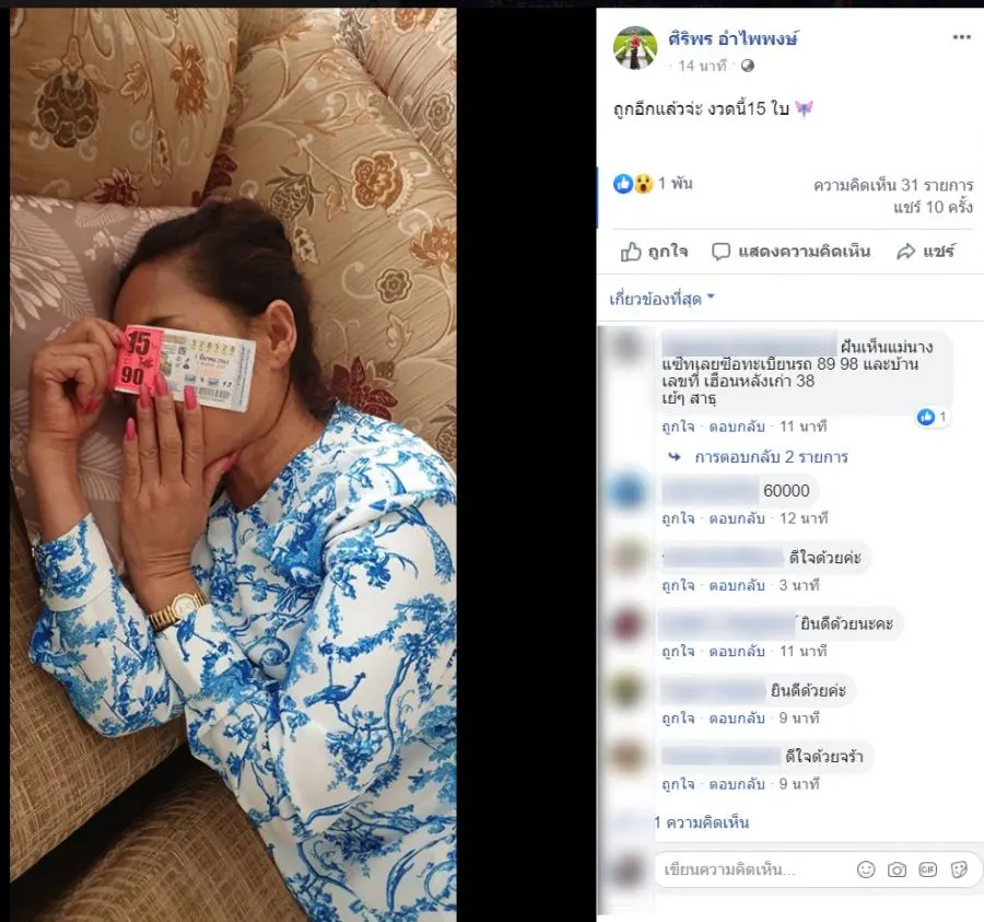 ล่าสุด ศิริพร อำไพพงษ์ ได้โพสต์ภาพ พร้อมระบุข้อความเพียงสั้นๆ ว่า “ถูกอีกแล้วจ่ะ งวดนี้15 ใบ” งานนี้ทำเอาชาวเน็ตเข้ามาแสดงความยินดีกับความโชคดีของเจ้าแม่กันแบบนับไม่ถ้วน ซึ่งงวดนี้แม่ถูกเลขสามตัวหน้านั่นก็คือ 328 15 ใบ นั่นเอง