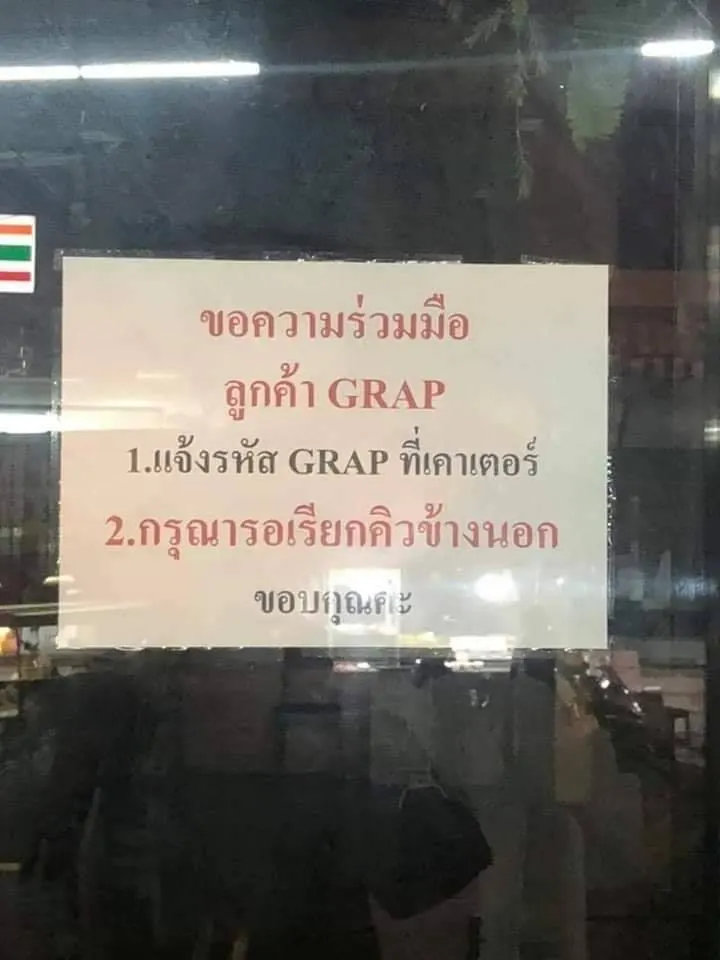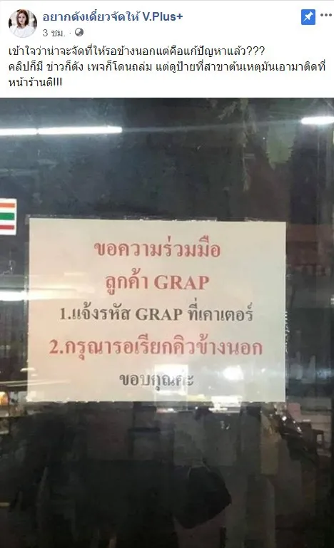 กรณีคลิปที่กำลังเป็นประเด็น หลังพนักงานส่งอาหาร แกร็บฟู้ด ได้เข้าไปสั่งเครื่องดื่มให้กับลูกค้า แต่โดนทางร้านไล่ให้ออกไปรอข้างนอก และไม่ยอมทำเครื่องดื่มให้ตามที่ลูกค้าสั่งมา ล่าสุดเพจ อยากดังเดี๋ยวจัดให้ V.Plus+ ได้โพสต์ภาพป้ายติดประกาศของร้านกาแฟสาขาต้นเหตุ ซึ่งมีข้อความระบุว่า
