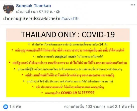 เรียกได้ว่าเป็นอีกหนึ่งโพสต์ที่ได้รับความสนใจอย่างมาก เมื่อวันที่ 1 มี.ค. รศ.นพ.สมศักดิ์ เทียมเก่า จากโรงพยาบาลศรีนครินทร์ ได้โพสต์ข้อความลงในเฟซบุ๊กส่วนตัว “Somsak Tiamkao” โดยขึ้นหัวข้อว่า ฝากท่านผู้บริหารประเทศด้วยครับ #covid19