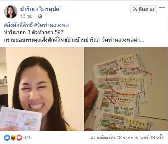 ล่าสุดวันที่ 2 มีนาคม กลายเป็นที่ฮือฮาในโซเชียลมีเดีย เมื่อ นางสาว ปารีณา ไกรคุปต์ สส ราชบุรี พรรคพลังประชารัฐ พปชร ได้โพสต์ภาพเจ้าตัวยิ้มกว้างพร้อมลอตเตอรี่ที่ถูกรางวัลเลขท้าย 3 ตัว 597 ประจำวันที่ 1 มีนาคม 2563 พร้อมข้อความระบุว่า สิ่งศักดิ์สิทธิ์ วัดท่าหลวงพล ปารีณาถูก 3 ตัวท้ายค่า 597 กราบขอบพระคุณสิ่งศักดิ์สิทธ์ข้างบ้านปารีณา วัดท่าหลวงพลค่า