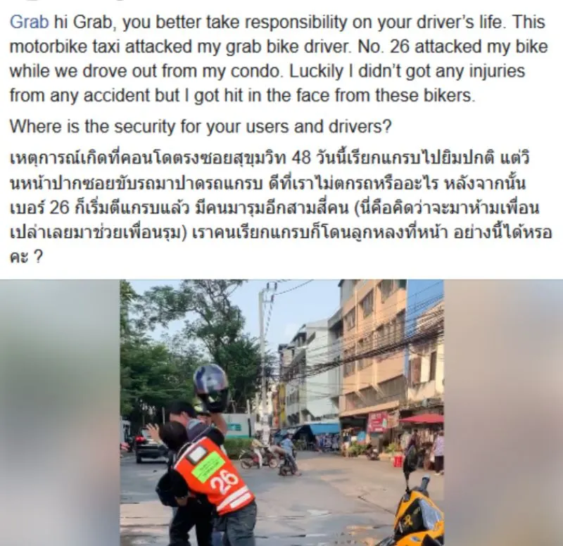 เหตุการณ์เกิดที่คอนโดตรงซอยสุขุมวิท 48 วันนี้เรียกแกรบไปยิมปกติ แต่วินหน้าปากซอยขับรถมาปาดรถแกรบ ดีที่เราไม่ตกรถหรืออะไร หลังจากนั้น เบอร์ 26 ก็เริ่มตีแกร็บแล้ว มีคนมารุมอีกสามสี่คน นี่คือคิดว่าจะมาห้ามเพื่อน เปล่าเลยมาช่วยเพื่อนรุม เราคนเรียกแกร็บก็โดนลูกหลงที่หน้า อย่างนี้ได้หรอคะ