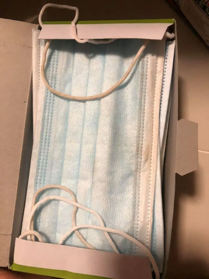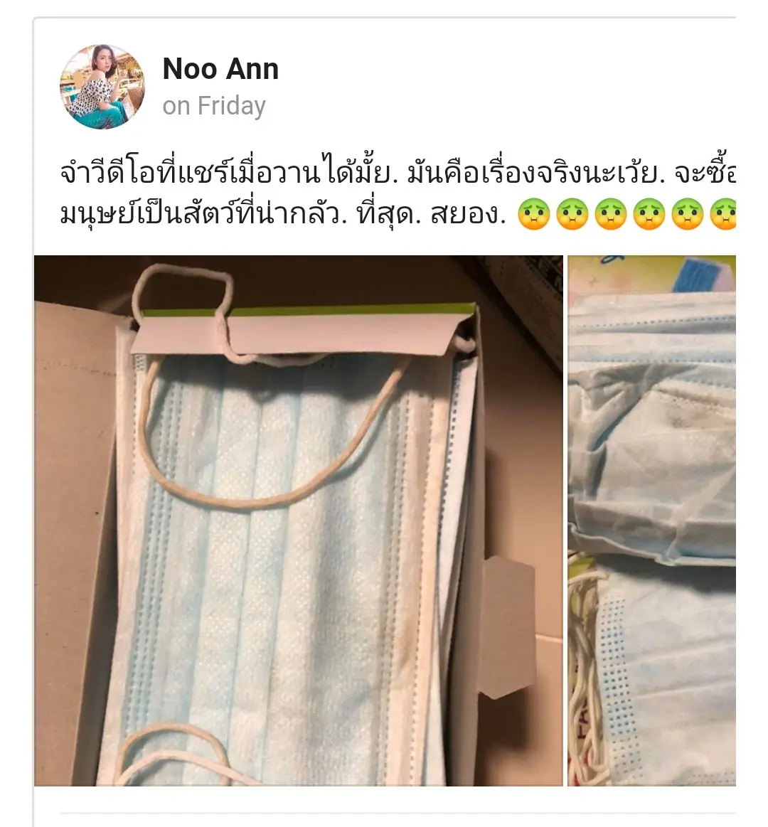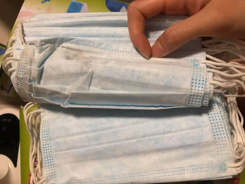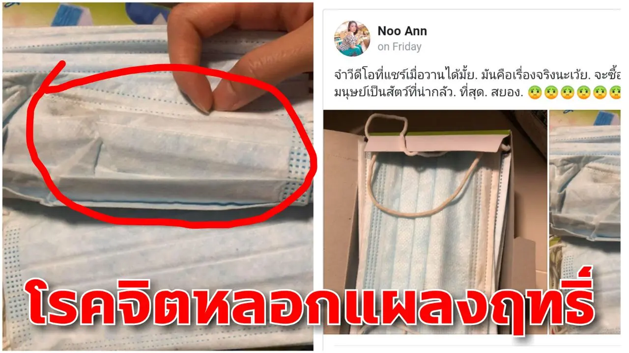 ผู้ใช้เฟซบุ๊ก "Noo Ann" ได้โพสต์ข้อความพร้อมภาพ เผยให้เห็นหน้ากากอนามัยที่เต็มไปด้วยคราบดำเหมือนผ่านการใช้งานมาแล้ว ซึ่งผู้โพสต์ได้ซื้อหน้ากากอนามัยมาจำนวน 1 แพ็ค แต่พอเปิดกล่องมาถึงกลับช็อค เมื่อเจอหน้ากากอนามัยที่เต็มไปด้วยคราบดำ สายรัดมีคาบเหลือง คาดว่าน่าจะผ่านการใช้งานมาแล้ว