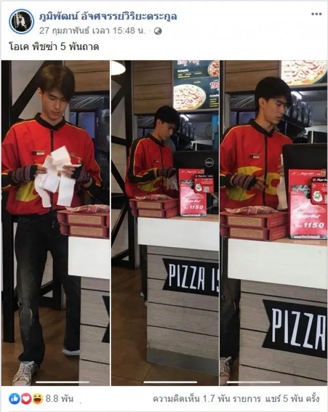 ผู้ใช้เฟซบุ๊คคุณ ภูมิพัฒน์ อัจศจรรย์วิริยะตระกูล ได้โพสต์ภาพของพนักงานหนุ่มร้าน Pizza hut ที่กำลังเตรียมนำพิซซ่าไปส่งให้ลูกค้า ซึ่งหนุ่มพนักงานพิซซ่าคนดังกล่าว หน้าตาหล่อเหลาเอาการเลยทีเดียว จากภาพดังกล่าวได้มีทั้งบรรดาสาวน้อยสาวใหญ่ต่างก็เข้ามาแสดงความคิดเห็นกันเป็นจำนวนมากและอยากจะหาพิกัดร้านพิซซ่าเลยทีเดียว