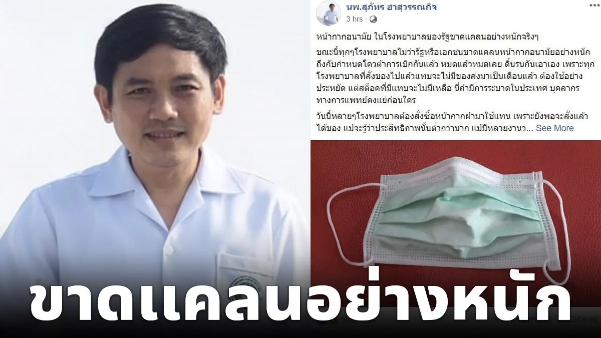 ผอ.รพ. เผยความจริง หน้ากากอนามัยในรพ.ของรัฐ ขาดเเคลนอย่างหนัก เรามีเวลาเหลือไม่มากในการรองรับการระบาดภายในประเทศ