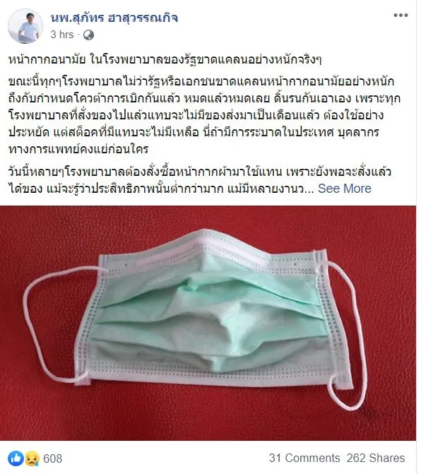 หน้ากากอนามัย ในโรงพยาบาลของรัฐขาดแคลนอย่างหนักจริงๆ ความจริงที่เปิดเผยจาก นพ.สุภัทร ฮาสุวรรณกิจ ผู้อำนวยการโรงพยาบาลจะนะ จ.สงขลา
