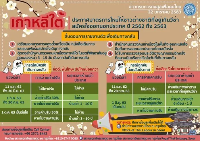ซึ่งปัจจุบัน ทางการเกาหลีใต้มีมาตรการให้ชาวต่างชาติที่พำนักอยู่เกินวีซ่า แสดงความสมัครใจออกนอกประเทศได้ถึงวันที่ 30 มิ.ย. 2563 โดยไม่ต้องเสียค่าปรับ และไม่มีโทษห้ามกลับเข้าเกาหลีใต้