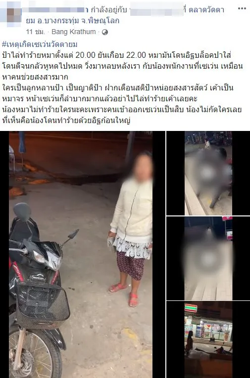 เหตุเกิดเซเว่นวัดตายมป้าไล่ทำร้ายหมาตั้งแต่ 20.00 ยันเกือบ 22.00 หมามันโดนอิฐบล็อคปาใส่โดนตีจนกลัวหูหดไปหมด วิ่งมาหลบหลังเรา กับน้องพนักงานที่เซเว่น เหมือนหาคนช่วยสงสารมากใครเป็นลูกหลานป้า เป็นญาติป้า ฝากเตือนสติป้าหน่อยสงสารสัตว์ เค้าเป็นหมาจร หน้าเซเว่นก็ลำบากมากแล้วอย่าไปไล่ทำร้ายเค้าเลยคะน้องหมาไม่ทำร้ายใครนะคะเพราะคนเข้าออกเซเว่นเป็นสิบ น้องไม่กัดใครเลย ที่เห็นคือน้องโดนทำร้ายด้วยอิฐก้อนใหญ่