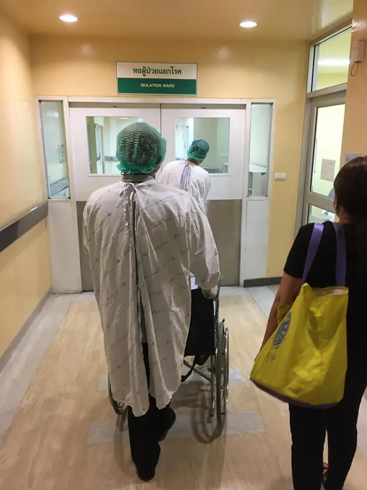 เรา3คน แม่ เตี่ย ลูกมุ่งหน้า สถาบันบำราศนราดูร ที่อยู่ในกระทรวงสาธารณสุข ทันทีไม่ไกลห่างบ้านเราไปแค่ 15 นาทีเท่านั้น พอถึงเข้าไปแจ้งเราทางนั้นให้ทำประวัตินั่งรอ ผลการตอบกลับจากคณะทำงาน ตอนนั้นประมาณ 23.00น. แล้ว เรื่องนี้ต้องวิ่งไปหลายต่อจนถึงผู้ที่สั่งการลงมาได้ ต้องหาห้องแยกผู้ป่วยเฉพาะต้องระดม แพทย์ และพยาบาลเฉพาะ ผมเลยพาไตเติ้ล มานั่งรถในรถเพราะไม่อยากให้อยู่รวมกับคนอื่นๆตรงนั้น ผมพูดกับเค้าว่าไม่ต้องกลัวนะลูกเราเจอกันมาเยอะแล้วนี่ก็เป็นอีกประสบการณ์ใหม่ของเราไตเติ้ลหันมายิ้มผมรู้เลยว่าเค้าไม่ได้วิตกอะไรมาก สิ่งที่ลูกบอกผมคือเตี่ยถ้าเติ้ลต้องนอนที่นี่หาอะไรมาไห้เติ้ลกินหน่อยนะเติ้ลเริ่มหิว แล้ว ประมาณ 40 นาที คุณป้าพยาบาลผู้ใจดีพาเราไปที่ห้องเจ้าหน้าที่ เข็นเตียงมาแล้วให้เรารออยู่ตรงนี้ เด่วจะมีทีมมาพาพวกเราไปอีกที 0:15 น. ทีมมาถึงพาพวกเราไปที่หอผู้ป่วยแยกโรค ผมได้แค่ไปส่งด้านหน้าเพราะอนุญาตให้อยู่เฝ้าได้แค่คนเดียว เราจะรู้ผลอีกทีประมาณเทีัยงพรุ่งนี้ ยุ้ยและไตเติ้ลจะออกห้องแยกโรคไปไหนไม่ได้จนกว่าผลจะออกมา ผมก็ทำหน้าที่ไปหาอาหารไปฝากส่งที่คุณพยาบาล แล้วกลับมาตั้งสติที่บ้านต่อ