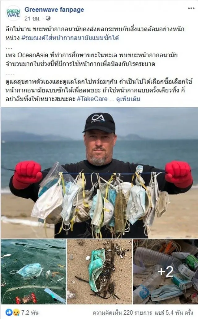 อีกไม่นาน ขยะหน้ากากอนามัยคงส่งผลกระทบกับสิ่งแวดล้อมอย่างหนักหน่วง รณณงค์ใส่หน้ากากอนามัยแบบซักได้ เพจ OceanAsia ที่ทำการศึกษาขยะในทะเล พบขยะหน้ากากอนามัยจำนวนมากในช่วงนี้ที่มีการใช้หน้ากากเพื่อป้องกันโรคระบาx ดูแลสุขภาพตัวเองและดูแลโลกไปพร้อมๆกัน ถ้าเป็นไปได้เลือกซื้อเลือกใช้หน้ากากอนามัยแบบซักได้เพื่อลดขยะ ถ้าใช้หน้ากากแบบครั้งเดียวทิ้ง ก็อย่าลืมทิ้งให้เหมาะสมนะคะ