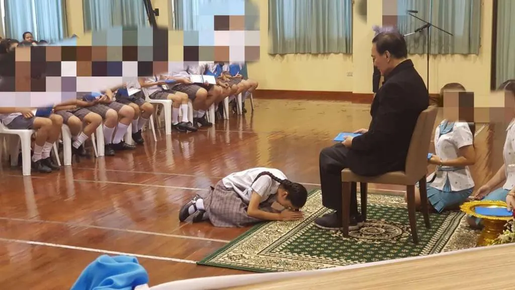 โรงเรียนเอกชนจัดงานจบการศึกษารับใบประกาศ ให้นักเรียนกราบเจ้าของ โรงเรียน3คน เพื่อรับใบประกาศ ย้ำกราบเจ้าของโรงเรียนครับไม่ใช่ครูอาจารย์ครับ ผู้ปกครองที่ไปร่วมงานส่งในกรุ๊ปไลน์ ผมถึงเห็น ระดับอนุบาลก็ยืนรับปกติ แต่ ป.6 ให้ทำแบบนี้ผมว่าไม่เหมาะสม
