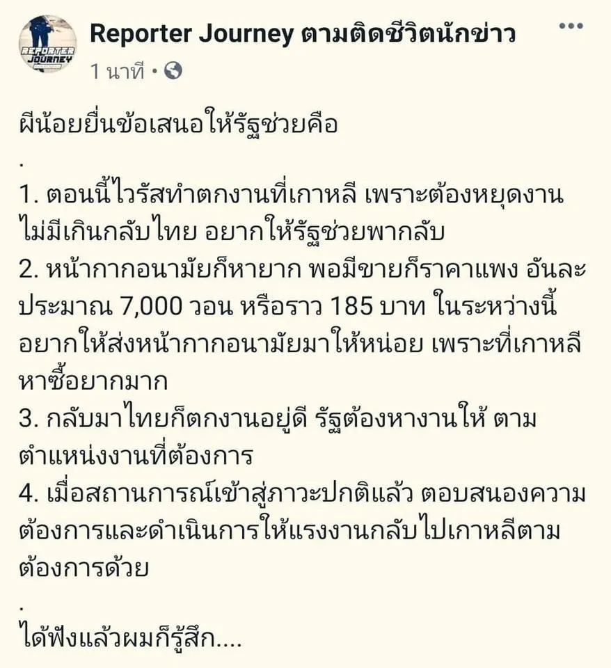 "ผีน้อยเกาหลี" ร้องรัฐฯ พากลับบ้าน ขอตั๋วเครื่องบิน - หน้ากากอนามัย และหางานใหม่ให้ทำที่ไทยด้วย