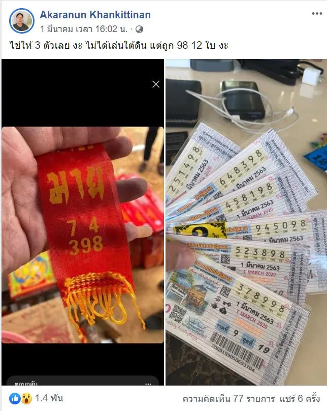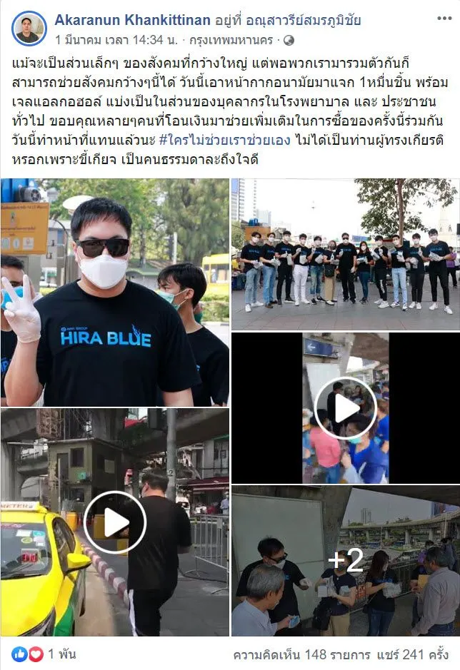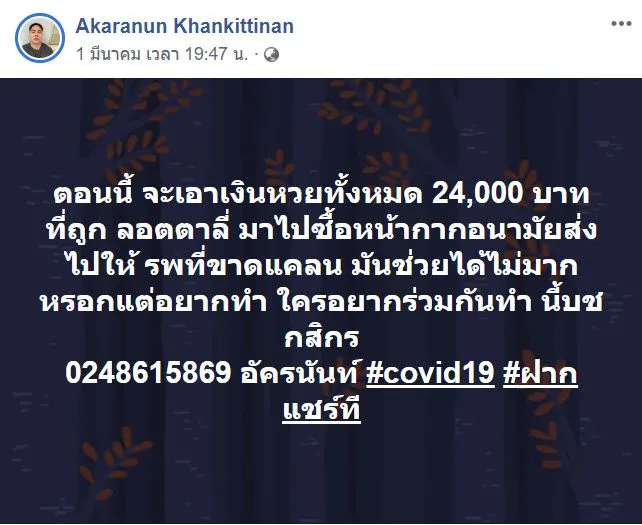 ล่าสุดผู้ใช้เฟซบุ๊กชื่อคุณ Akaranun Khankittinan ได้ทำความดีแก่สังคมด้วยการนำเงินที่ตนเองถูกลอตเตอรี่รางวัลเลขท้าย 2 ตัว 98 ถึง 12 ใบไปซื้อหน้ากากอนามัยและเอาไปบริจาคช่วยชาวบ้านและโรงพยาบาลหลายกว่า 22 แห่ง ซึ่งหนุ่มใจบุญคนนี้ได้โพสต์ผ่านเฟซบุ๊กส่วนตัวว่า "ของก็ต้องขาย น้ำใจก็ต้องทำ"