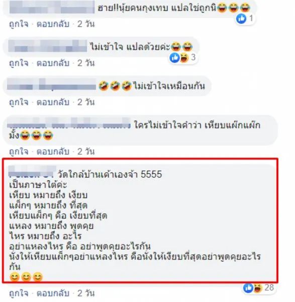 ทั้งนี้มีผู้ใช้เฟซบุ๊กท่านหนึ่งมาไขความกระจ่างว่าข้อความดังกล่าวนั้นแปลว่าอะไร เป็นภาษาใต้ค่ะ เ...ยบ หมายถึง เงียบ แผ็กๆ หมายถึง ที่สุด เ...ยบแผ็กๆ คือ เงียบที่สุด แหลง หมายถึง พูดคุย ไหร หมายถึง อะไร อย่าแหลงไหร คือ อย่าพูดคุยอะไรกัน นั่งให้เ...ยบแผ็กๆอย่าแหลงไหร คือนั่งให้เงียบที่สุดอย่าพูดคุยอะไรกัน