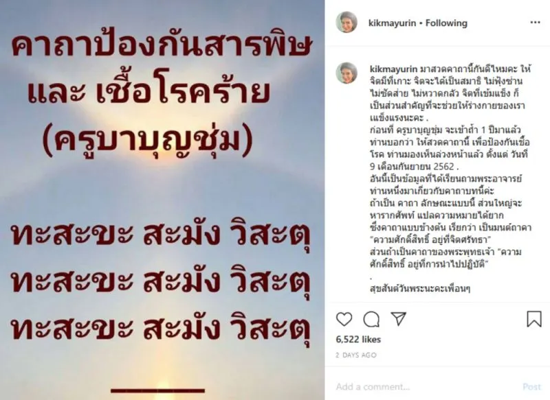เรียกได้ว่าเป็นนักแสดงอีกหนึ่งท่าน ที่มีความเลื่อมใสในพระพุทธศาสนาเป็นอย่างมาก ถึงกับขั้นบวชชีเพื่อไปศึกษาพระธรรมให้เข้าใจลึกซึ้งมาแล้ว สำหรับนางร้ายคนเก่ง กิ๊ก มยุริญ ผ่องผุดพันธ์ และล่าสุด ในสถานการณ์ที่ประเทศจีน แพร่อย่างหนักไปทั่วโลกในหลายประเทศ สาวกิ๊กก็มีคาถาป้องกัน ของครูบาบุญชุ่มมาให้ทุกคนได้สวด ซึ่งเจ้าตัวโพสต์ลงในอินสตาแกรมพร้อมข้อความว่า