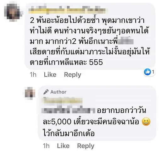 ซึ่งงานนี้ฝั่งผีน้อยเองก็หัวร้อน ฉะกลับคนที่เข้ามาต่อว่า โดยอวดว่าตัวเองทำงานค่าแรงวันละ 2,000 บาท แต่คนที่มาเหยียดค่าแรงวันละ 300 เหยียดเพราะอคติหรืออิจฉา บางคนก็บอกว่า ถ้ากลับไปจะเป็นซอมบี้แพร่เชื้อ