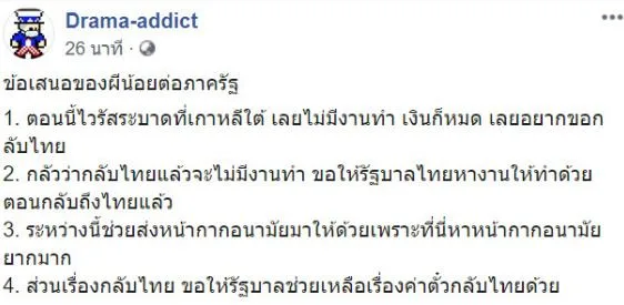 - ตอนนี้ไวรัสระบาดที่เกาหลีใต้ เลยไม่มีงานทำ เงินก็หมด เลยอยากขอกลับไทย