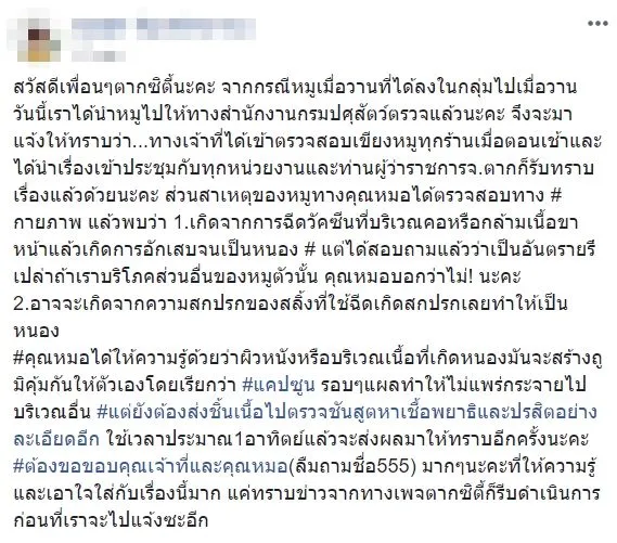 ผู้ใช้เฟซบุ๊กโพสต์ข้อความระบุว่า.. จากกรณีหมูเมื่อวาน วันนี้เราได้นำหมูไปให้ทางสำนักงานกรมปศุสัตว์ตรวจแล้วนะคะ จึงจะมาแจ้งให้ทราบว่า…ทางเจ้าที่ได้เข้าตรวจสอบเขียงหมูทุกร้านเมื่อตอนเช้าและได้นำเรื่องเข้าประชุมกับทุกหน่วยงานและท่านผู้ว่าราชการ จ.ตาก ก็รับทราบเรื่องแล้วด้วยนะคะ ส่วนสาเหตุของหมูทางคุณหมอได้ตรวจสอบทางกายภาพ แล้วพบว่า 1.) เกิดจากการฉีดวัคซีนที่บริเวณคอหรือกล้ามเนื้อขาหน้าแล้วเกิดการอักเสบจนเป็นหนอง แต่ได้สอบถามแล้วว่าเป็นอันตรายรึเปล่าถ้าเราบริโภคส่วนอื่นของหมูตัวนั้น คุณหมอบอกว่าไม่! นะคะ