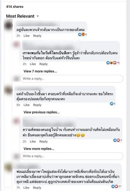 ทำให้มีชาวเน็ตเข้ามาแสดงความคิดเห็นกันอย่างต่อเนื่อง โดยส่วนใหญ่เข้ามาคอมเม้นต์ว่า ควรสรรเสริญพวกมึงตรงไหน บ้างก็เข้ามาคอมเม้นต์ว่า ไปถูกกฎหมายหมายแต่แรกใครจะว่าพวกมึง บ้างก็เข้ามาคอมเม้นต์ว่า เกลียดผีน้อยทุกตัวที่ชอบอ้างความจน โอ้อวดว่าอยู่เกาหลีดีกว่าไทย และโพสต์ภาพชีวิตดีๆ เพื่อกลบปมด้อยในใจ พอเจอภาวะโรคระบาดเข้าไป งอแงอยากกลับไทยทันที…ไม่อายบ้างเหรอ?