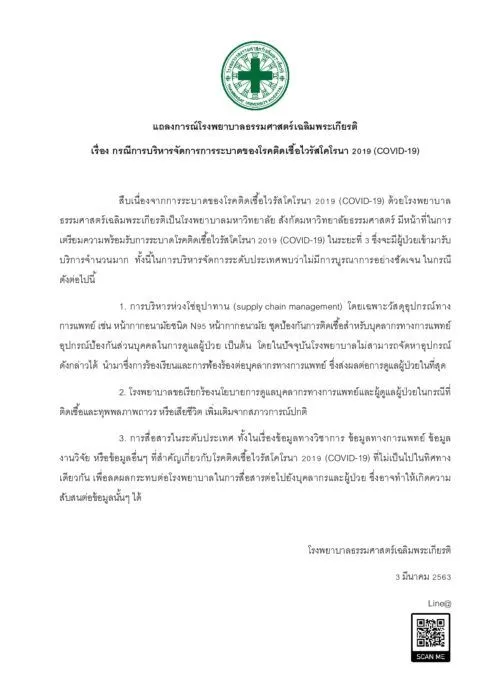 วันที่ 4 มีนาคม 2563 ทางโรงพยาบาลธรรมศาสตร์เฉลิมพระเกียรติ จังหวัดปทุมธานี เผยแพร่แถลงการณ์ เรื่อง กรณีการบริหารจัดการการระบาดของโรคติดเชื้อไวรัสโคโรนาสายพันธุ์ใหม่ 2019 หรือ COVID-19 ระบุรายละเอียด 3 ข้อดังต่อไปนี้