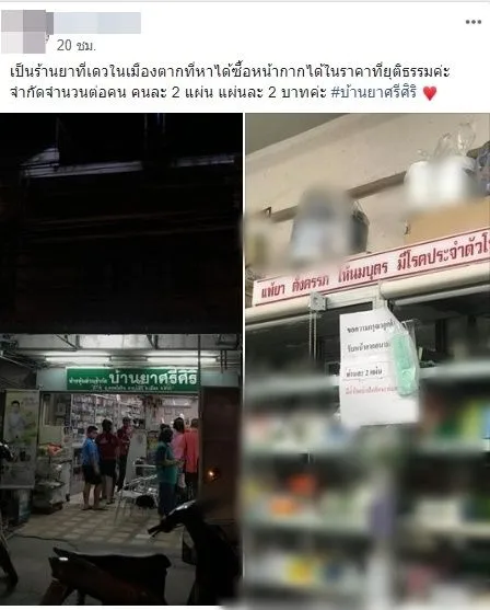 ล่าสุดได้มีผู้ใช้เฟซบุ๊กท่านหนึ่งได้มีการโพสต์รูปภาพพร้อมทั้งระบุข้อความว่า.. เป็นร้านยาที่ดียวในเมืองตากที่หาได้ซื้อหน้ากากได้ในราคาที่ยุติธรรมค่ะ จำกัดจำนวนต่อคน คนละ 2 แผ่น แผ่นละ 2 บาทค่ะ #บ้านยาศรีศิริ