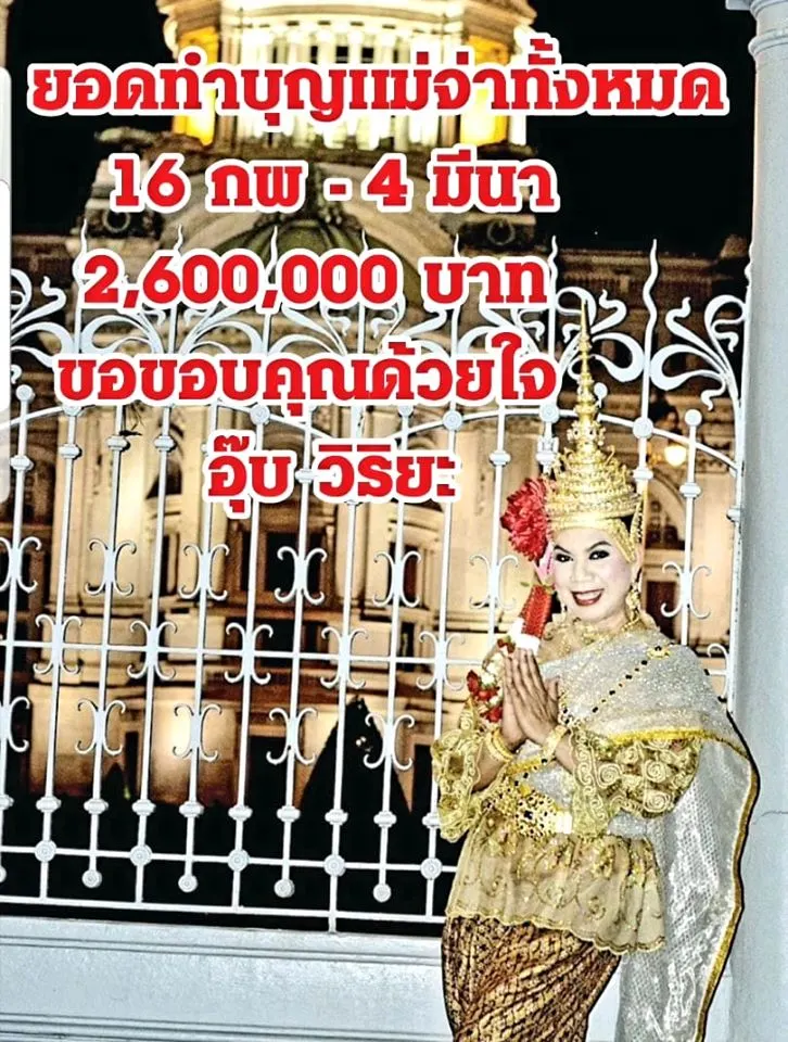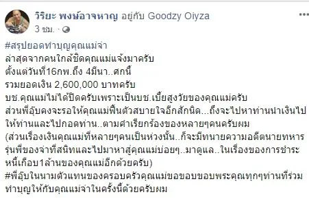 สรุปยอดทำบุญคุณแม่จ่า ล่าสุดจากคนใกล้ชิดคุณแม่แจ้งมาครับ ตั้งแต่วันที่16กพ.ถึง 4มีนา..ศกนี้ รวมยอดเงิน 2,600,000 บาทครับ บช.คุณแม่ไม่ได้ปิดครับเพราะเป็นบช.เบี้ยสูงวัยของคุณแม่ครับ ส่วนพี่อุ๊บคงจะรอให้คุณแม่ฟื้นตัวสบายใจอีกสักนิด…ถึงจะไปหาท่านนำเงินไปให้ท่านและไปกอดท่าน..ตามคำเรียกร้องของหลายๆคนครับผม (ส่วนเรื่องเงินคุณแม่ที่หลายๆคนเป็นห่วงนั้น..ก็จะมีทนายความอดีตนายทหารรุ่นพี่ของจ่าที่สนิทและไปมาหาสู่คุณแม่บ่อยๆ..มาดูแล..ในเรื่องของการชำระหนี้เกือบ1ล้านของคุณแม่อีกด้วยครับ)