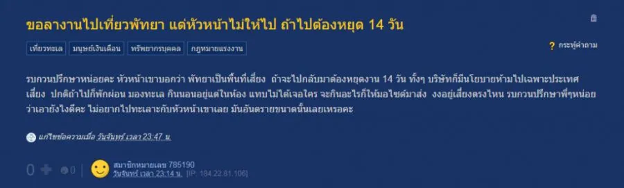 สาวขอหัวหน้าลางานไปเที่ยวพัทยา แต่ถูกปฎิเสธ ถ้าไปต้องหยุดงาน 14 วัน หวั่นติดเชื้อโควิด-19