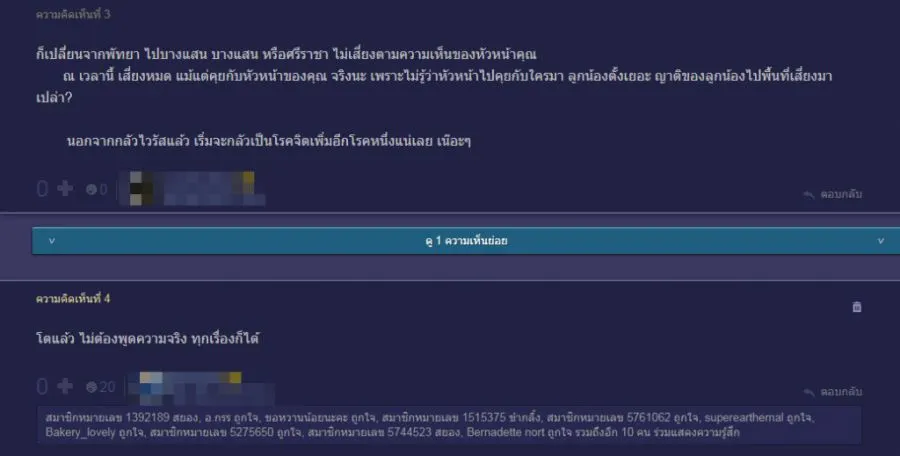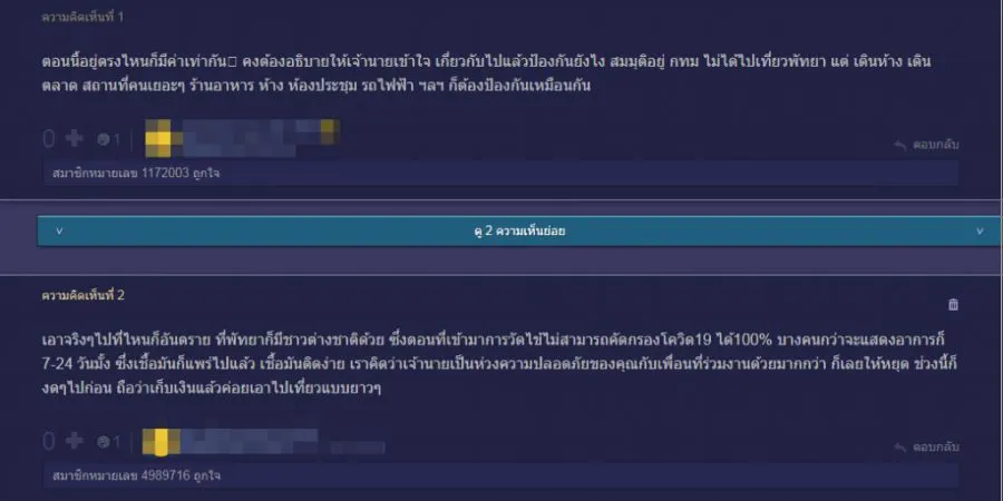 โดย สมาชิกพันทิปหมายเลข 785190 ได้โพสต์ถามข้อความเห็นจากชาวเน็ต โพสตระบุข้อความว่า ” รบกวนปรึกษาหน่อยคะ หัวหน้าเขาบอกว่า พัทยาเป็นพื้นที่เสี่ยง ถ้าจะไปกลับมาต้องหยุดงาน 14 วัน ทั้งๆ บริษัทก็มีนโยบายห้ามไปเฉพาะประเทศเสี่ยง ปกติถ้าไปก็พักผ่อน มองทะเล กินนอนอยู่แต่ในห้อง แทบไม่ได้เจอใคร จะกินอะไรก็ให้มอไซด์มาส่ง งงอยู่เสี่ยงตรงไหน รบกวนปรึกษาพี่ๆหน่อยว่าเอายังไงดีคะ ไม่อยากไปทะเลาะกับหัวหน้าเขาเลย มันอันตรายขนาดนั้นเลยเหรอคะ”