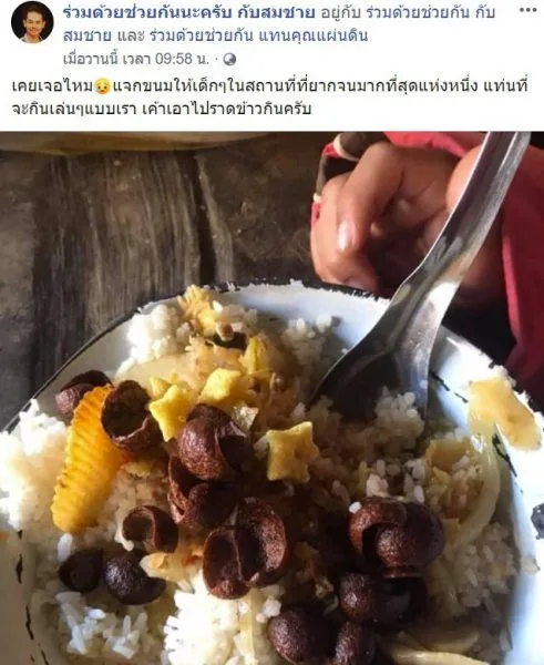 “เคยเจอไหม แจกขนมให้เด็กๆในสถานที่ที่ยากจนมากที่สุดแห่งหนึ่ง แทนที่จะกินเล่นๆแบบเรา เค้าเอาไปราดข้าวกินครับ”