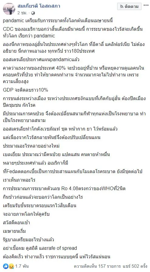 5 มี.ค. 2563 ดร.สมเกียรติ โอสถสภาได้โพสท์เฟซบุ๊ก ระบุว่า pandamic เตรียมรับการระบาดทั้งโลกต้นเดือนเมษายนนี้ CDC ของอเมริกาบอกว่าสิ้นเดือนมีนาคมนี้ การระบาดของไวรัสจะเกิดขึ้นทั่วโลก เรียกว่า pandamic