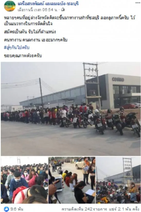 ตั้งแต่ช่วงต้นปีหลายๆบริษัททยอยปิดตัวลง ทำให้พนักงานหลายพันคนต้องตกงานกระทันหัน ล่าสุดเพจเฟสบุ๊ค เครือสหพัฒน์ แหลมฉบัง ชลบุรี ก็ได้ออกมาโพสต์ภาพผู้คนจำนวนมากรอคิวสมัครงานที่โรงงานใน จังหวัดชลบุรี โดยระบุว่า