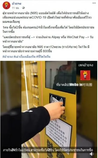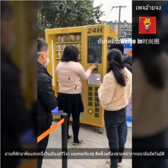 ล่าสุด ทางประเทศจีน ได้มีการเปิดตัวตู้ขายหน้ากากอนามัยอัตโนมัติ ในเมืองสวีโจว มณฑลเจียงซู ให้ประชาชนได้ซื้อหน้ากากอนามัยแบบง่ายๆ สะดวกสบาย โดยทางเพจ อ้ายจง ได้โพสต์คลิปพร้อมระบุว่า