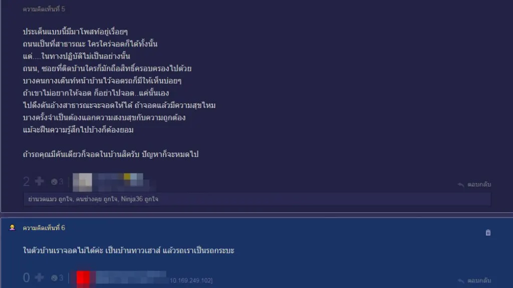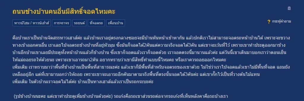 ต่อมาวันหนึ่ง เจ้าของบ้านตรงนั้นได้เดินมาบอกว่าให้เลื่อนรถออกไปได้หรือไม่ เพราะเขามีรถ 2 คัน ทำให้เจ้ากระทู้เกิดความสงสัยว่า การที่อีกฝ่ายทำแบบนี้มันถูกต้องแล้วเหรอ เพราะพื้นที่ตรงนั้นเป็นถนนสาธารณะ การที่ตนนำรถไปจอดตรงนั้น ก็ไม่ได้ทำให้อีกฝ่ายมีที่จอดแต่อย่างใด อีกทั้งอีกฝ่ายยังเอาต้นไม้มาวางไว้ด้วย ทำให้ตรงนั้นไม่สามารถจอดได้ 3 คัน ก็เหลือเพียง 2 คันเท่านั้น