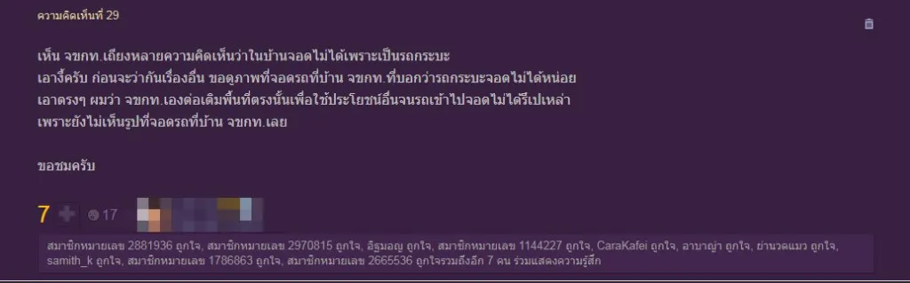 ซึ่งตั้งหัวข้อกระทู้เรื่องว่า ” ถนนข้างบ้านคนอื่นมีสิทธิ์จอดไหมคะ”โดยเนื้อหาในกระทู้ดังกล่าวเป็นเรื่องราวที่ได้ซื้อบ้านทาวเฮาส์ ทั้งนี้ ไม่สามารถจอดรถตรงหน้าบ้านตัวเองได้ เพราะทำให้ขวางทางคนอื่น ดังนั้นจึงนำไปจอดที่หัวมุมถนนอีกฝั่ง ซึ่งสามารถจอดได้ 2 คัน โดยในจุดนั้นมีรถเจ้าของกระทู้จอดอยู่ และเจ้าของบ้านตรงหัวมุมจับจองที่จอดเอาไว้