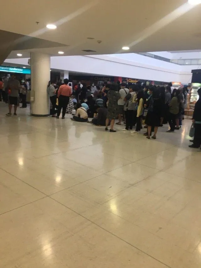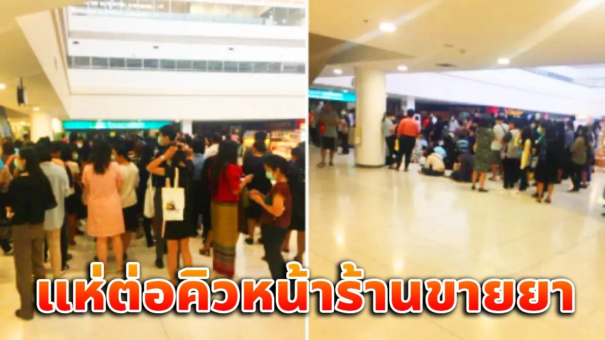 ประชาชนเข้าแถวยืนรอหน้าร้านเภสัชกรรมที่ยังไม่เปิดเป็นจำนวนมาก