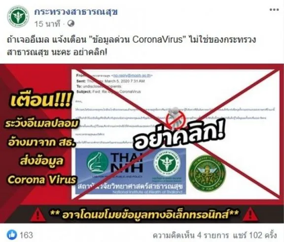 โดยทางเพจกระทรวงสาธารณสุขได้โพสต์เตือนภัย ระบุข้อความว่า ถ้าเจออีเมล แจ้งเตือน “ข้อมูลด่วน CoronaVirus” ไม่ใช่ของกระทรวงสาธารณสุขนะคะ อย่าคลิก!