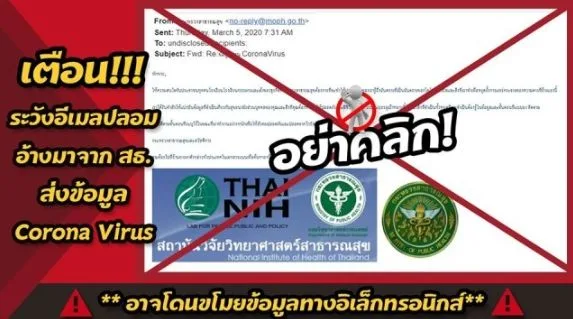 ล่าสุด กระทรวงสาธารณสุขก็ได้มีการออกมาเตือนประชาชน หลังจากมีพวกมิจฉาชีพได้ฉวยวิกฤตในครั้งนี้ โดยการส่งลิงค์ปลอมเข้าอีเมล โดยอ้างว่าเป็นข้อมูลเกี่ยวกับไวรัสโควิด19 เพื่อให้ประชาชนคลิกเข้าไปอ่านและล้วงข้อมูลส่วนตัว