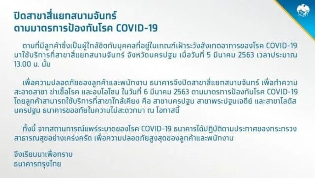 เมื่อวันที่ 5 มีนาคม 2563 เวลาประมาณ 13 00 น เพื่อความปลอดภัยของลูกค้าและพนักงาน ธนาคารจึงปิดสาขาสี่แยกสนามจันทร์ เพื่อทำความสะอาดสาขา อบโอโซนในวันที่ 6 มีนาคม 2563 ตามมาตรการป้องกัน covid โดยลูกค้าสามารถใช้บริการที่สาขาใกล้เคียง ธนาคารขออภัยในความไม่สะดวก