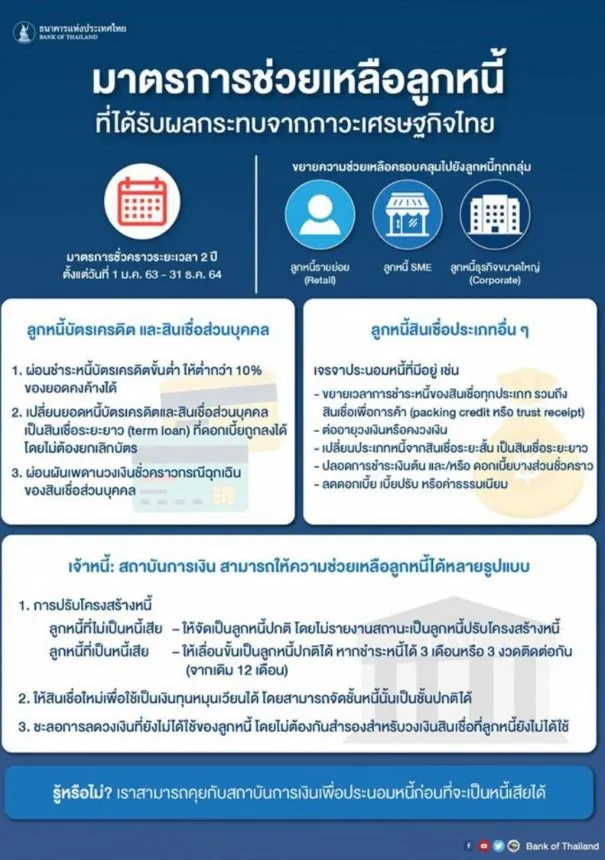 ทั้งนี้ สามารถติดตามมาตรการการให้ความช่วยเหลือต่างๆ ของแต่ละสถาบันการเงินผ่านเว็บไซต์ของสถาบันการเงินนั้นๆ และ ธปท.