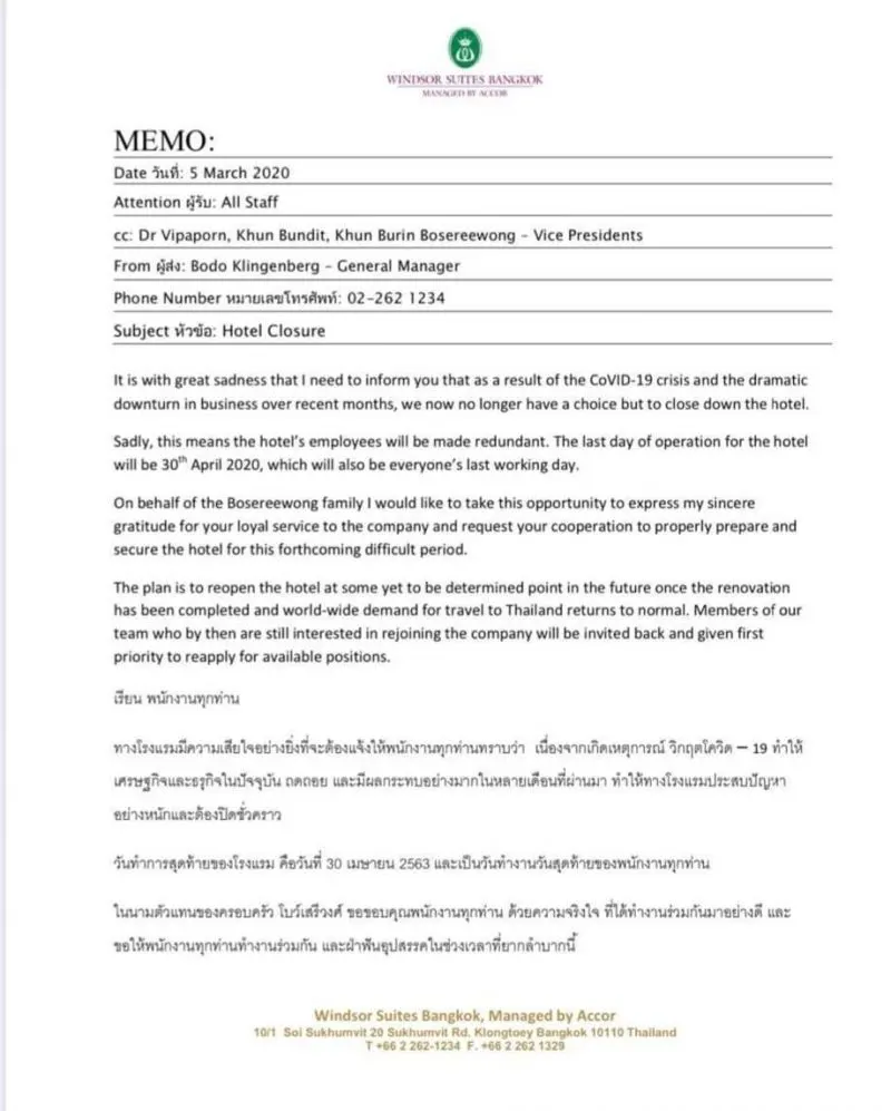 โรงแรมวินเซอร์ ได้ส่งหนังสือเวียนถึงพนักงาน ว่า ทางโรงแรมมีความเสียใจอย่างยิ่งที่จะต้องแจ้งให้พนักงานทุกท่านทราบว่า เนื่องจากเกิดเหตุการณ์ วิกฤตโควิด-19 ทำให้เศรษฐกิจและธุรกิจในปัจจุบัน ถดถอย และมีผลกระทบอย่างมากในหลายเดือนที่ผ่านมา ทำให้ทางโรงแรมประสบปัญหาอย่างหนักและต้องปิดชั่วคราว