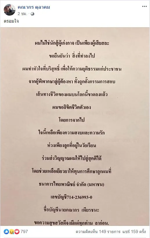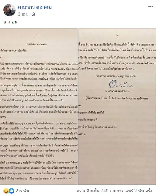 โดยในเฟซบุ๊กส่วนตัวของผู้พิพากษาคณากร ได้เผยแพร่เอกสารส่วนตัวลงลายมือชื่อ เนื้อหาสั่งลาสังคมและคนใกล้ชิด อ้างถูกตั้งกรรมการสอบสวนเกี่ยวกับหน้าที่และถูกดำเนินคดี พร้อมขอบริจาคเงินเข้าบัญชี เพื่อลูก
