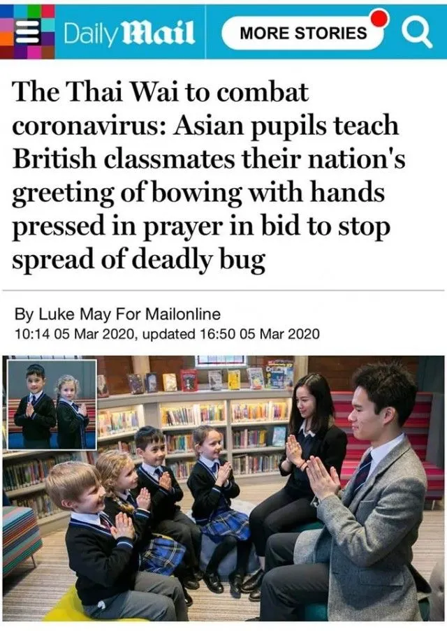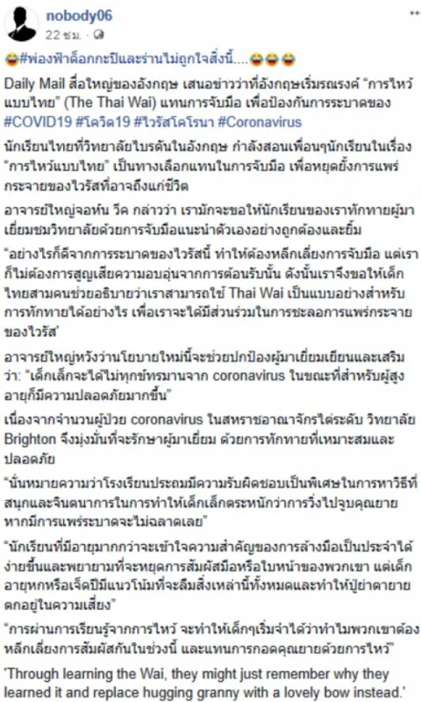6 มีนาคม 2563 เพจ nobody06 โพสท์ระบุ Daily Mail สื่อใหญ่ของอังกฤษ เสนอข่าวว่าที่อังกฤษเริ่มรณรงค์ การไหว้แบบไทย The Thai Wai แทนการจับมือ เพื่อป้องกัน CO VID นักเรียนไทยที่วิทลัยไบรตันในอังกฤษ กำลังสอนเพื่อนๆนักเรียนในเรื่อง การไหว้แบบไทย