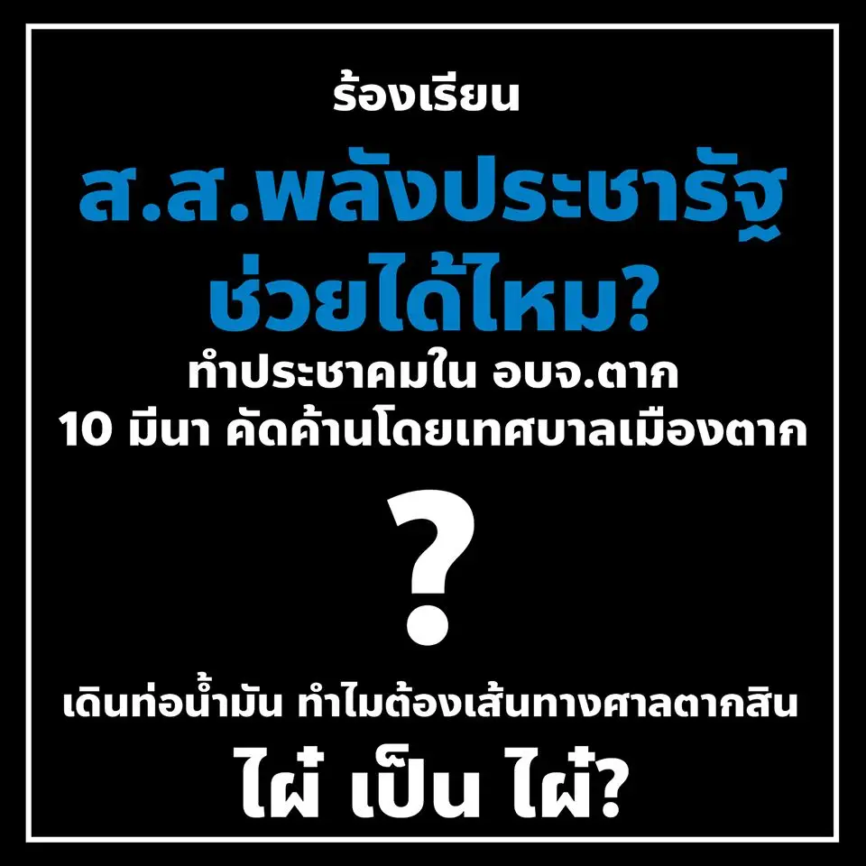คำถาม? คือ อยากให้ท่านนายกเทศมนตรี หารือกับท่านนายก อบจ.ตาก ร้องเรียนผ่านท่าน ส.ส.พรรคพลังประชารัฐ และรอฟังท่าทีจากท่านผู้ว่าราชการจังหวัดตากเสียก่อน น่าจะเป็นทางออกที่ดีกว่า และสอดคล้องกัน เพื่อให้เป็นที่พึ่งของประชาชนได้จริง