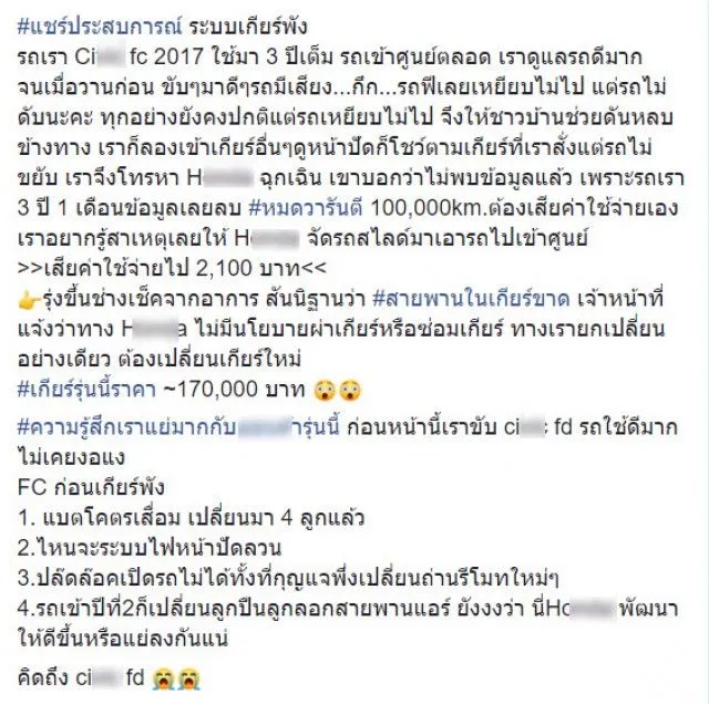 กลายเป็นอีกเรื่องราวที่คนมีรถ ต่างก็เข้าใจเป็นอย่างดี เมื่อรถถึงเวลาก็จะต้องเข้าศูนย์ ตรวจเช็คสภาพรถตามปกติและระยะเวลาที่จะต้องเข้าศูนย์ ล่าสุดผู้ใช้เฟซบุ๊กรายหนึ่ง แบ่งปันประสบการณ์ใช้งานรถยนต์โพสต์ข้อความระบุว่า แชร์ประสบการณ์ ระบบเกียร์พังรถเรา Civic fc 2017 ใช้มา 3 ปีเต็ม รถเข้าศูนย์ตลอด เราดูแลรถดีมาก
