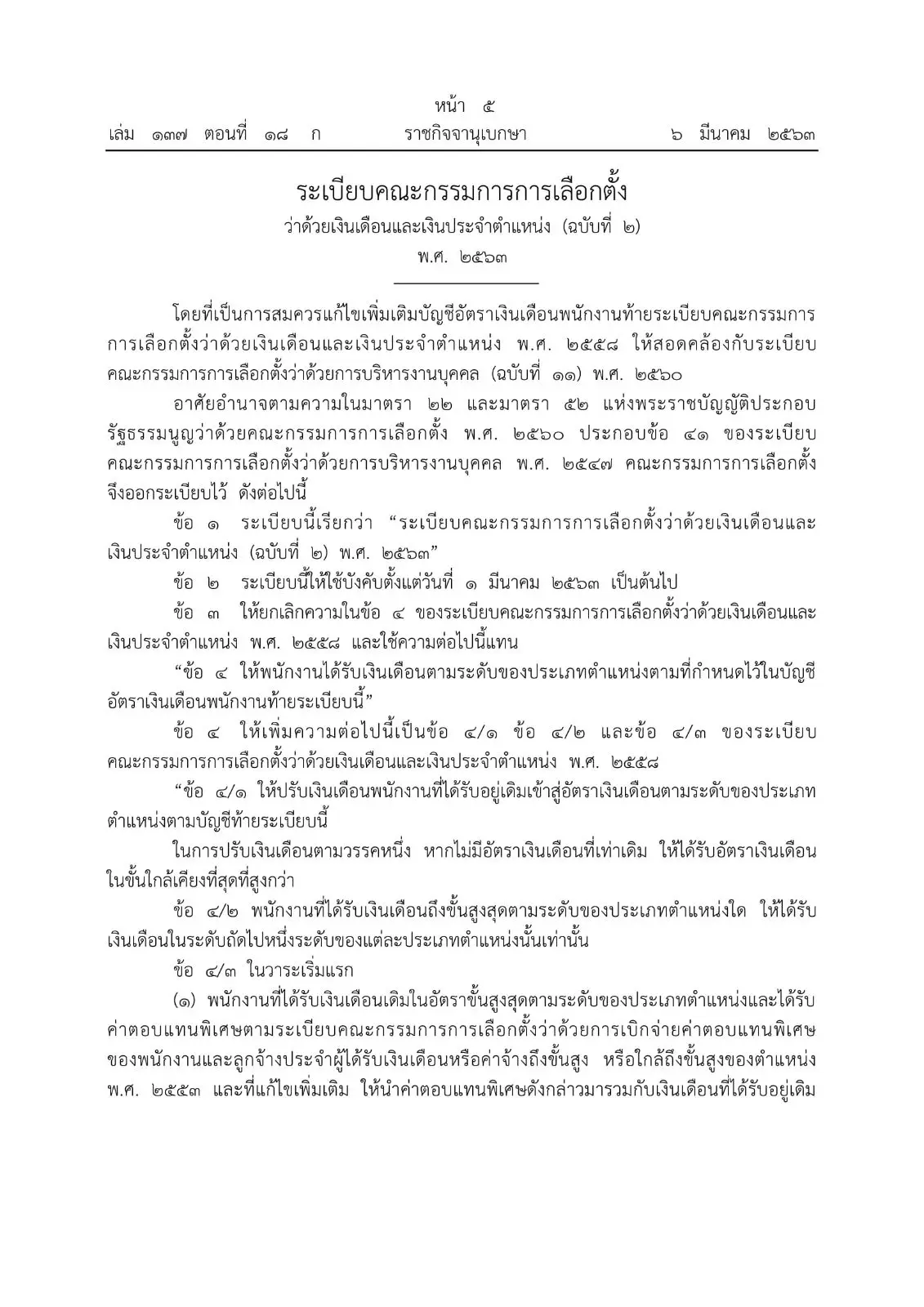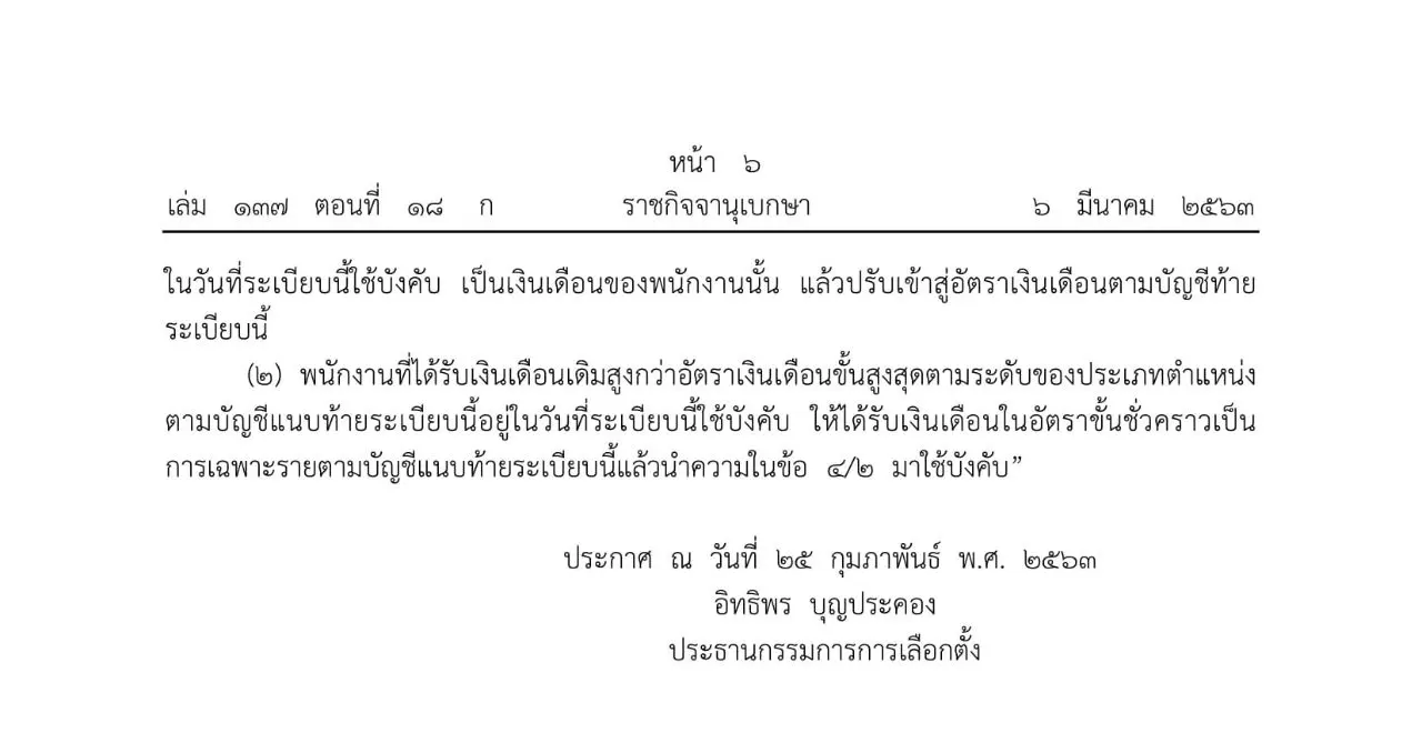7 มีนาคม 2563 เว็บไซต์ราชกิจจานุเบกษา เผยแพร่ ระเบียบคณะกรรมการการเลือกตั้ง ว่าด้วยเงินเดือนและเงินประจำตำแหน่ง (ฉบับที่2) พ.ศ. 2563 ความว่า โดยที่เป็นการสมควรแก้ไขเพิ่มเติมบัญชีอัตราเงินเดือนพนักงานท้ายระเบียบคณะกรรมการ การเลือกตั้งว่าด้วยเงินเดือนและเงินประจำตำแหน่ง พ.ศ. 2558 ให้สอดคล้องกับระเบียบ คณะกรรมการการเลือกตั้งว่าด้วยการบริหารงานบุคคล (ฉบับที่ 11) พ.ศ. 2560