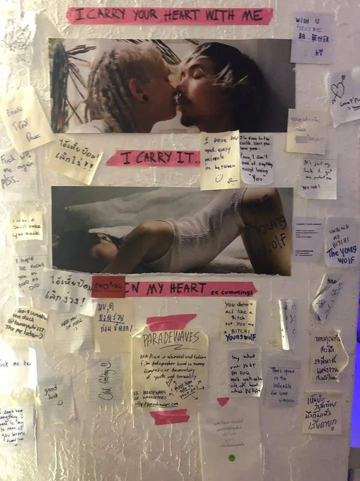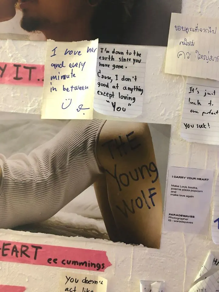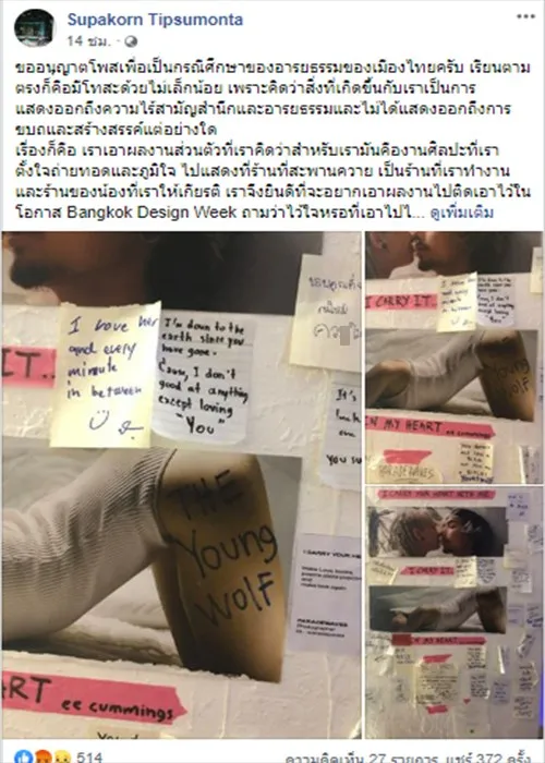 เรื่องก็คือ เราเอาผลงานส่วนตัวที่เราคิดว่าสำหรับเรามันคืองานศิลปะที่เราตั้งใจถ่ายทอดและภูมิใจ ไปแสดงที่ร้านที่สะพานควาย เป็นร้านที่เราทำงานและร้านของน้องที่เราให้เกียรติ เราจึงยินดีที่จะอยากเอาผลงานไปติดเอาไว้ในโอกาส Bangkok Design Week ถามว่าไว้ใจหรอที่เอาไปไว้ ใช่เราไว้ใจครับเพราะเราคิดว่าทุกคนที่ไปน่าจะมีสำนึกที่เข้าใจแล้วว่ามันเป็นผลงานส่วนบุคคลที่มีเจ้าของ และต้องลงทุนและมีคุณค่าไม่ว่าในทางใดก็ตาม งานชิ้นนี้เราให้ผู้ชมมีส่วนร่วมโดยการแปะโน๊ตถึงแฟนเก่ารอบผลงาน *ย้ำครับ แปะโน๊ต**ข้อความอย่างอิสระรอบๆผลงาน ไม่ใช่บนผลงาน