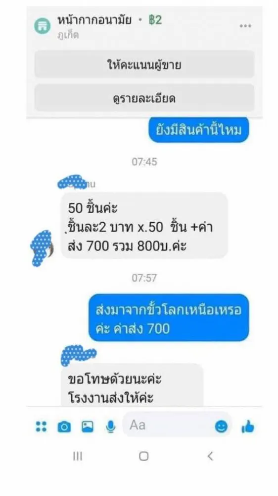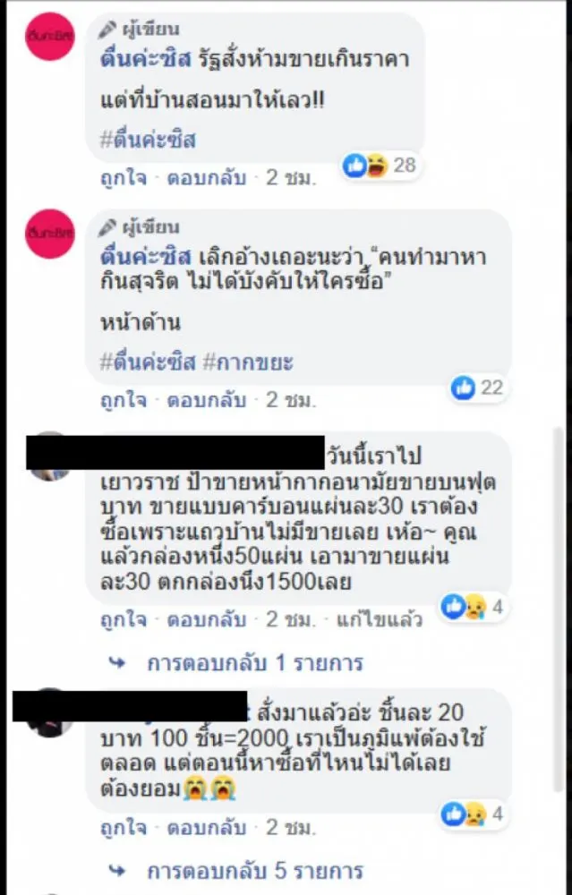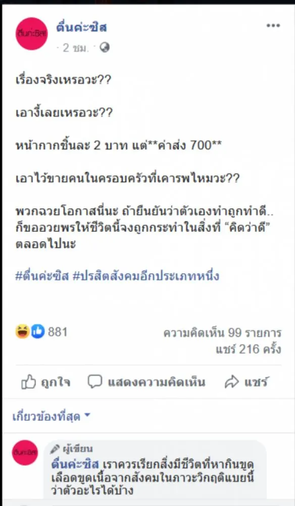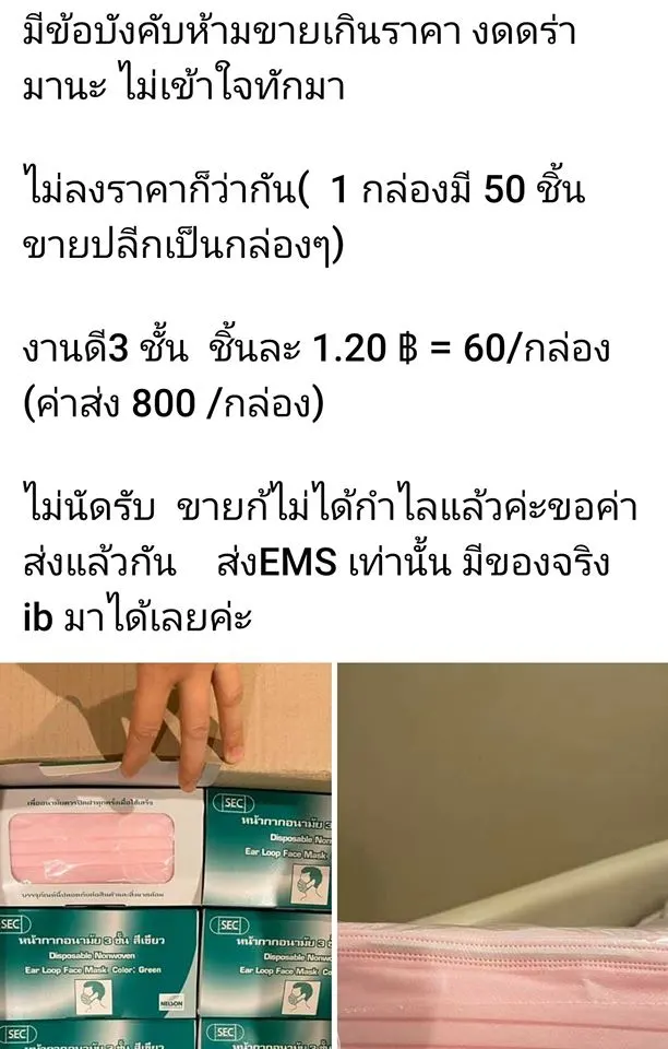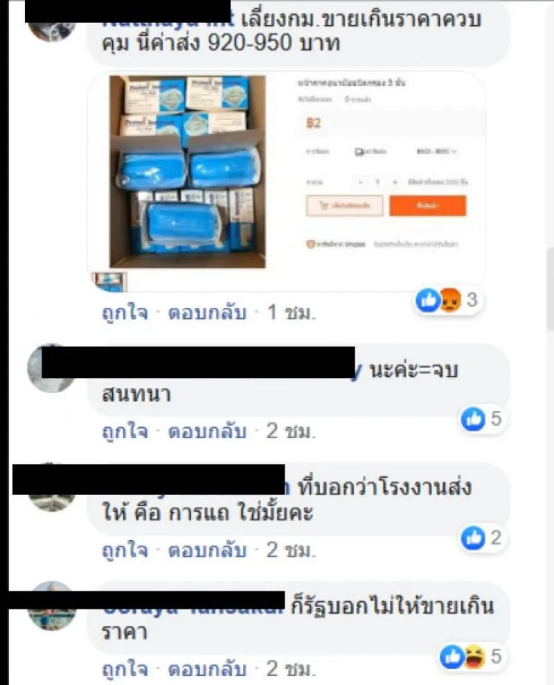 ล่าสุดผู้ใช้เพจเฟซบุ๊กชื่อ ตื่นค่ะซิส ได้โพสต์ข้อความระบุว่า เรื่องจริงเหรอวะ เอางี้เลยเหรอวะ หน้ากากชิ้นละ 2 บาท แต่ ค่าส่ง 700 เอาไว้ขายคนในครอบครัวที่เคารพไหมวะ พวกฉวยโอกาสนี่นะ ถ้ายืนยันว่าตัวเองทำถูกทำดี ก็ขออวยพรให้ชีวิตนี้จงถูกกระทำในสิ่งที่ คิดว่าดี ตลอดไปนะ